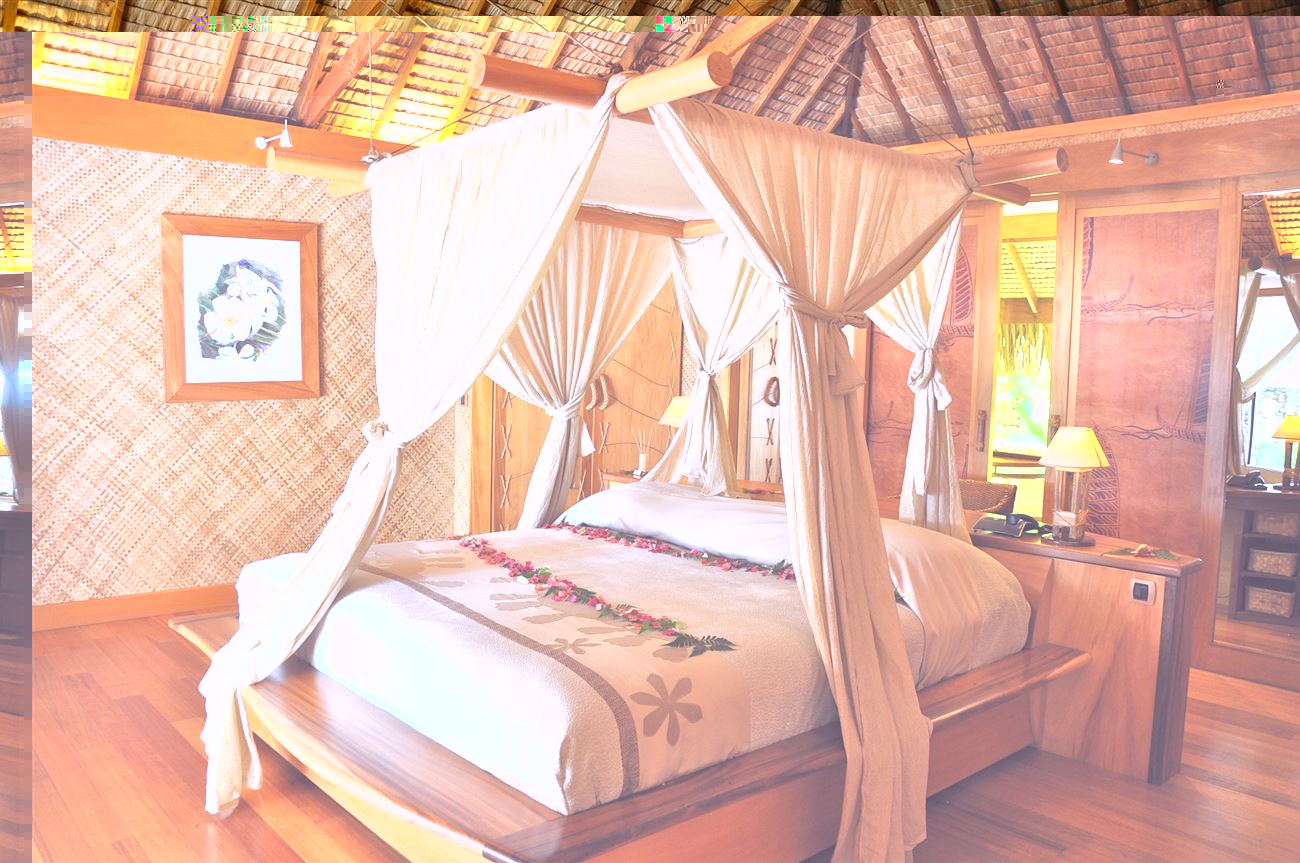Die Innenausstattung der Villa ist mit geschnitztem Holz, lokalen Materialien und polynesischen Kunstgemälden absolut authentisch. Im Hauptschlafzimmer öffnet sich das Badezimmer zu einem 7 m² großen Infinity-Pool. Sie haben Zugang zu einer 67 m² großen Terrasse, die sich auf einen Pergolenstrand mit Blick auf die Lagune von Taha'a erstreckt.